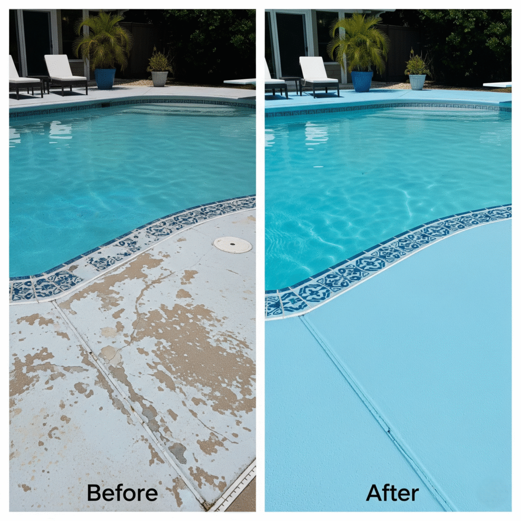 On average, pool decks in Florida should be repainted or recoated every 3–5 years, depending on sun exposure, foot traffic, and maintenance. With our professional coatings, many of our customers enjoy longer lifespans and reduced maintenance costs.